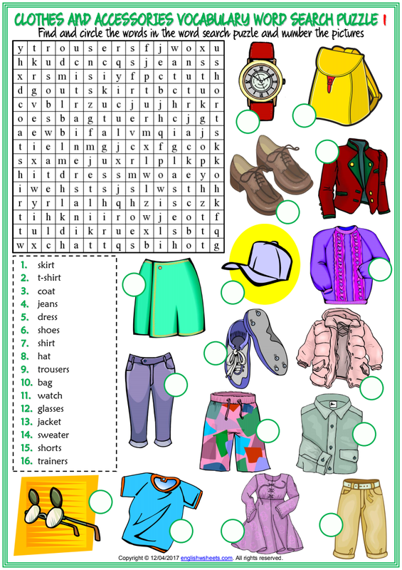 Clothes And Accessories Vocabulary Esl Word Search Puzzle Worksheets For Kids