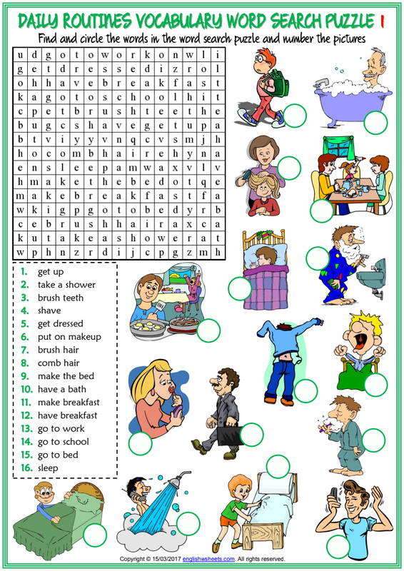 Daily Routines Vocabulary Esl Word Search Puzzle Worksheets For Kids